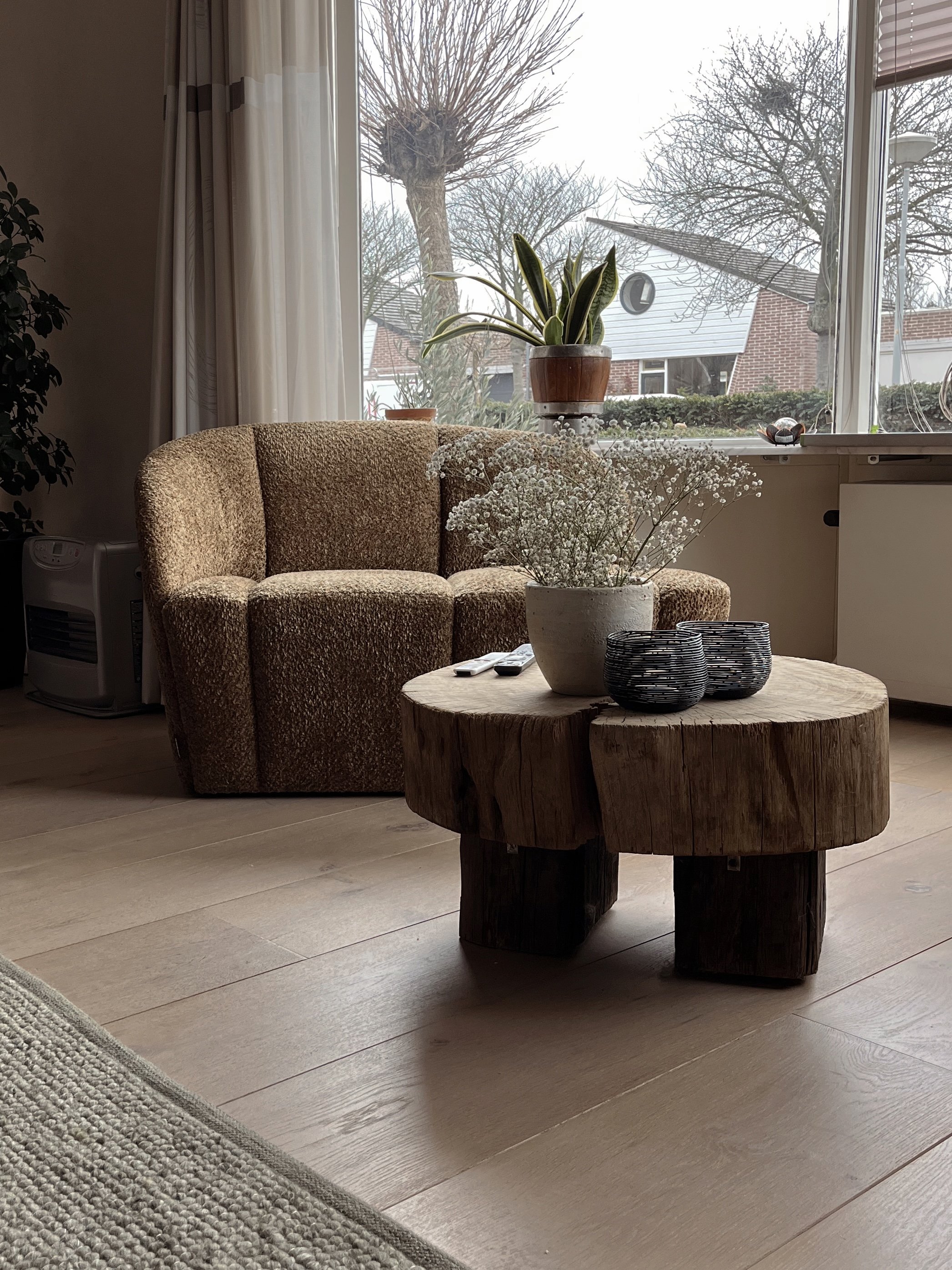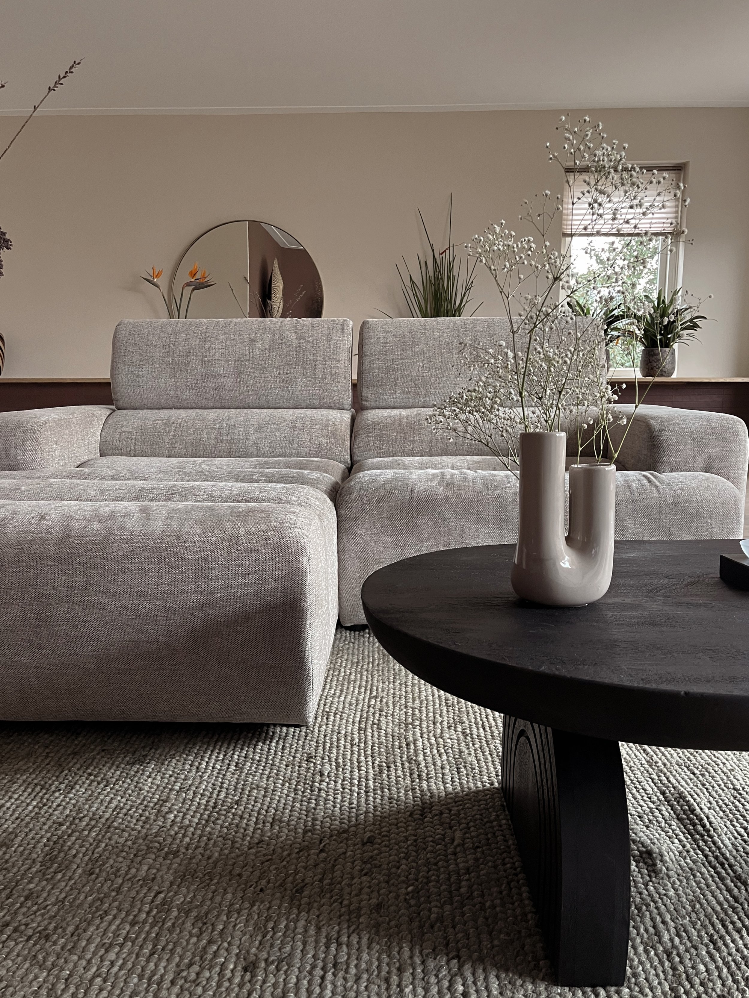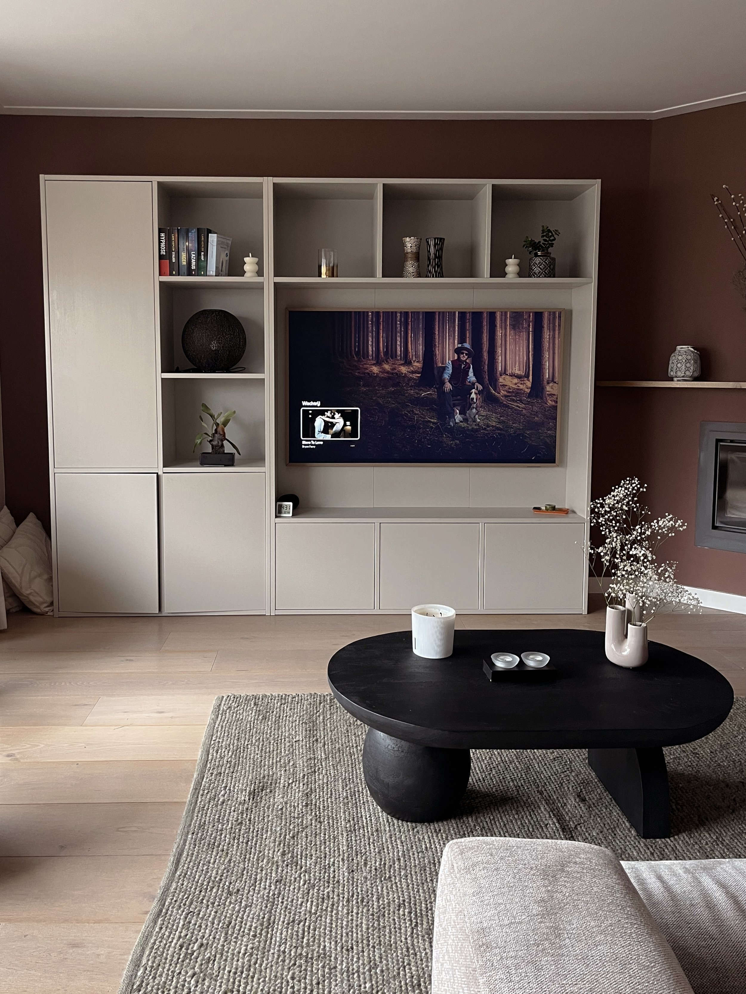 De grote tv kast en de donkere accentwand zorgen voor een krachtig middelpunt, terwijl lichte stoffen, houttinten en organische vormen het geheel verzachten. Alles is op elkaar afgestemd, met als doel een interieur dat warmte uitstraalt en waarin je echt tot rust komt.