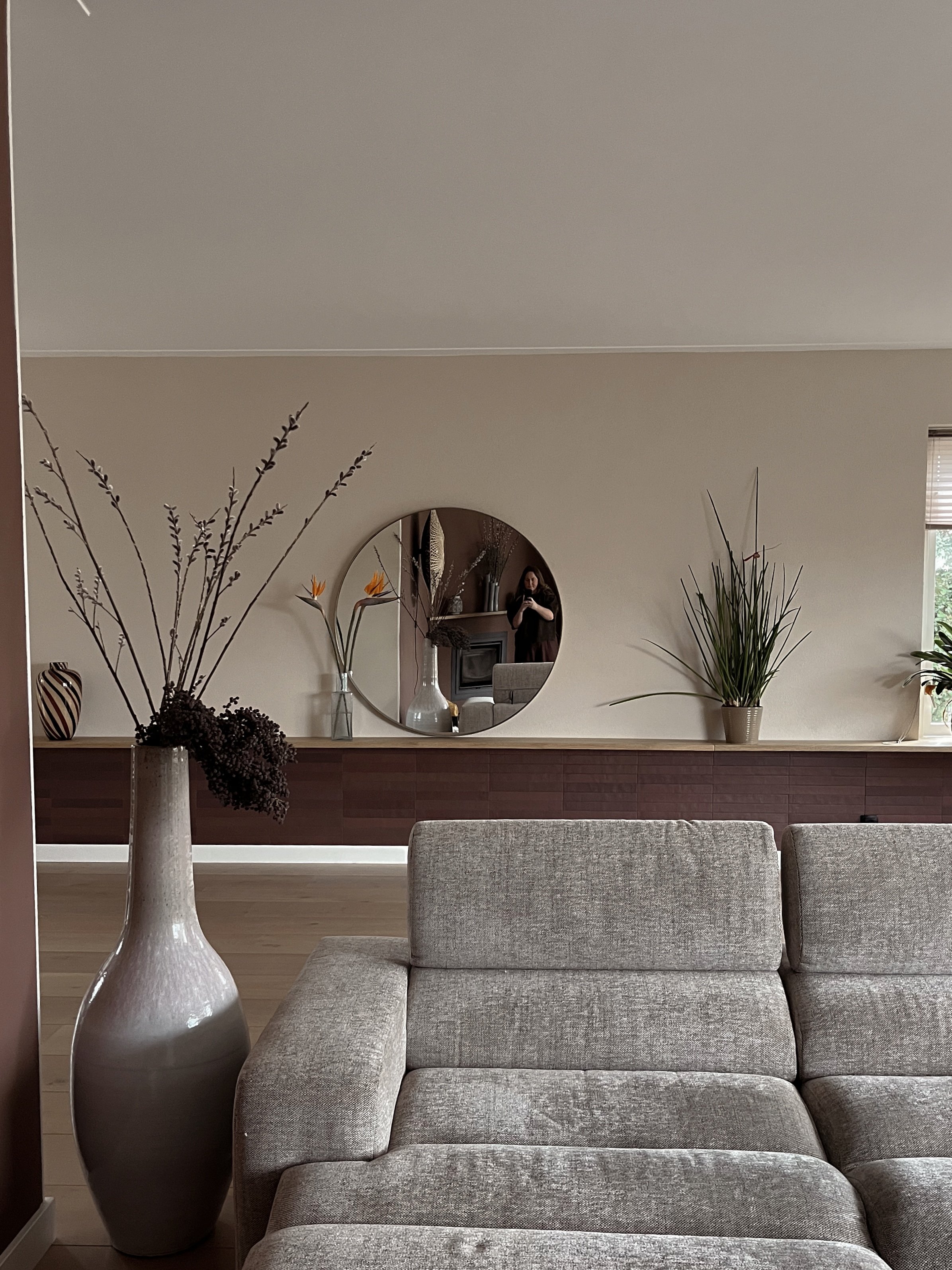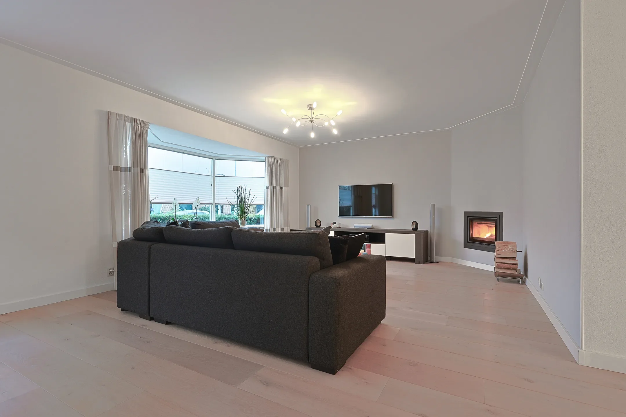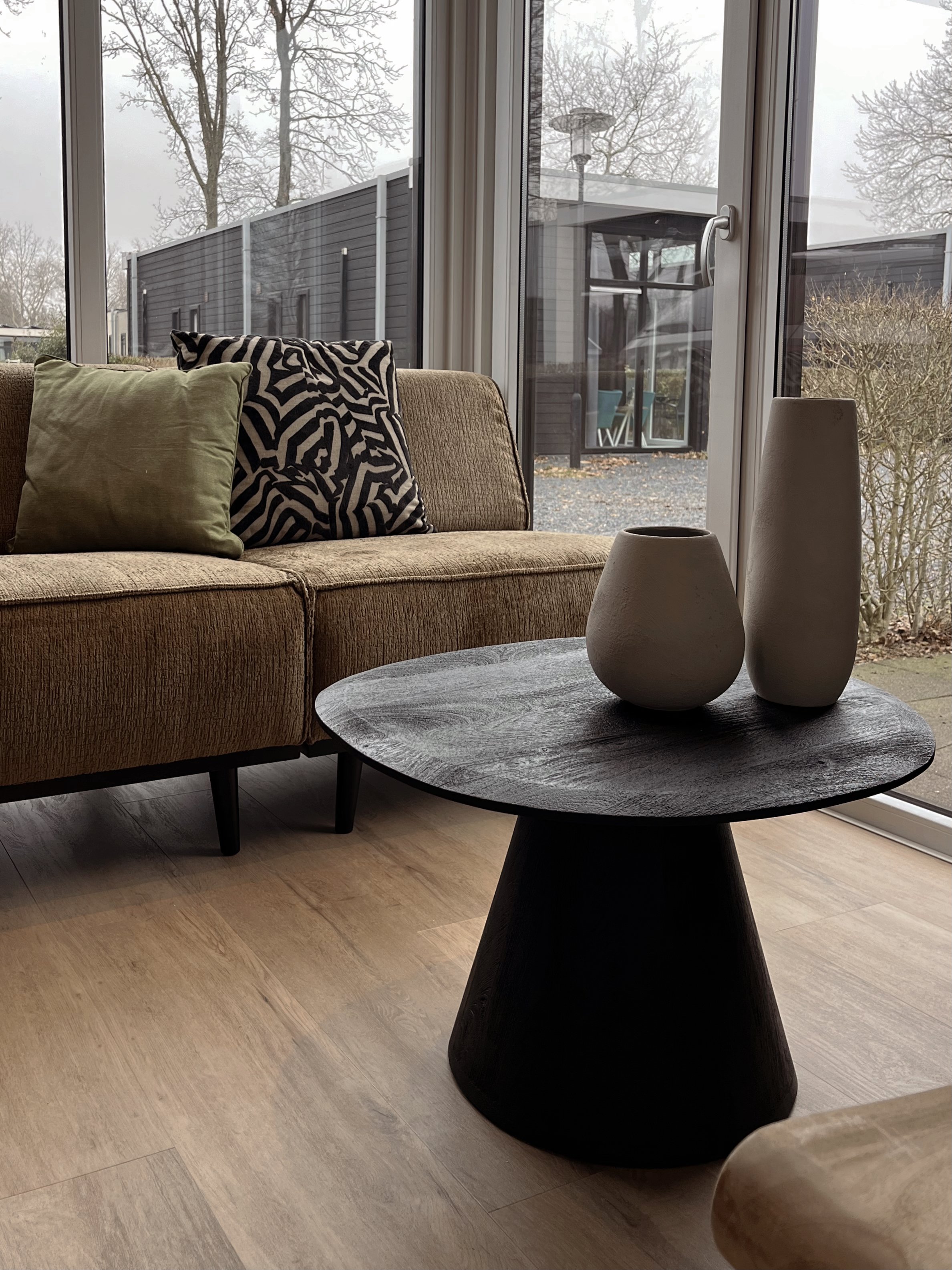 De grote tv kast en de donkere accentwand zorgen voor een krachtig middelpunt, terwijl lichte stoffen, houttinten en organische vormen het geheel verzachten. Alles is op elkaar afgestemd, met als doel een interieur dat warmte uitstraalt en waarin je echt tot rust komt.