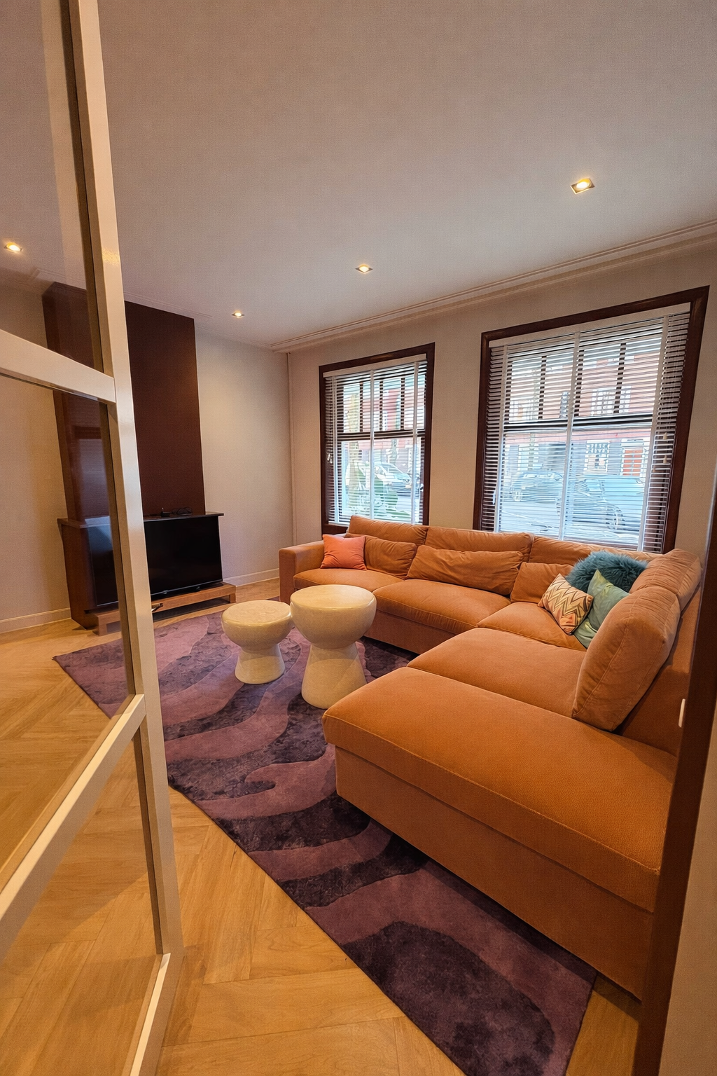 In deze woning heb ik de indeling compleet omgegooid. Wat eerst de eetkamer was, is nu een knusse, sfeervolle woonkamer geworden. Door de zithoek te verplaatsen naar de ruimere plek in huis, wordt de ruimte veel beter benut én voelt het meteen warmer aan.