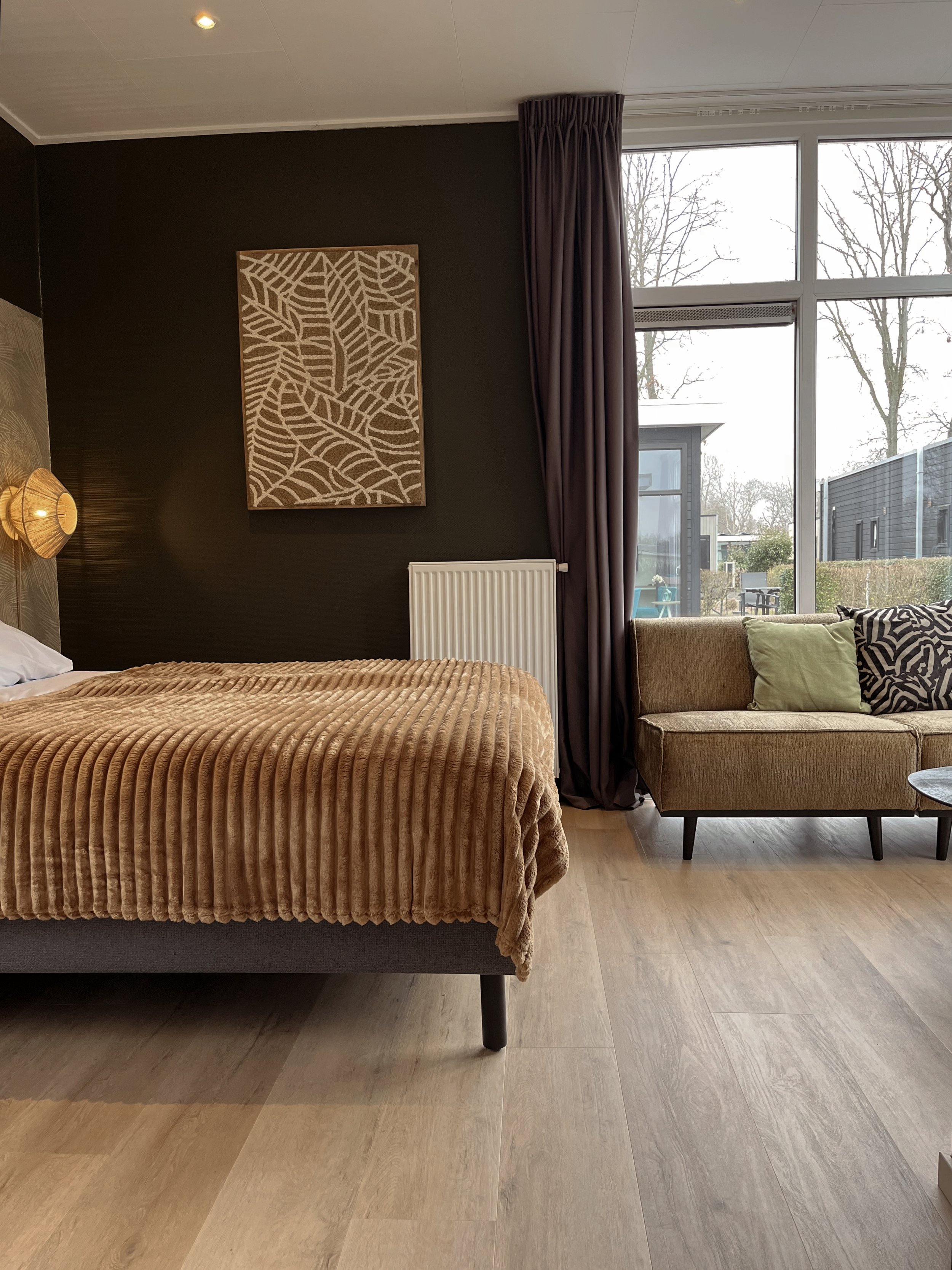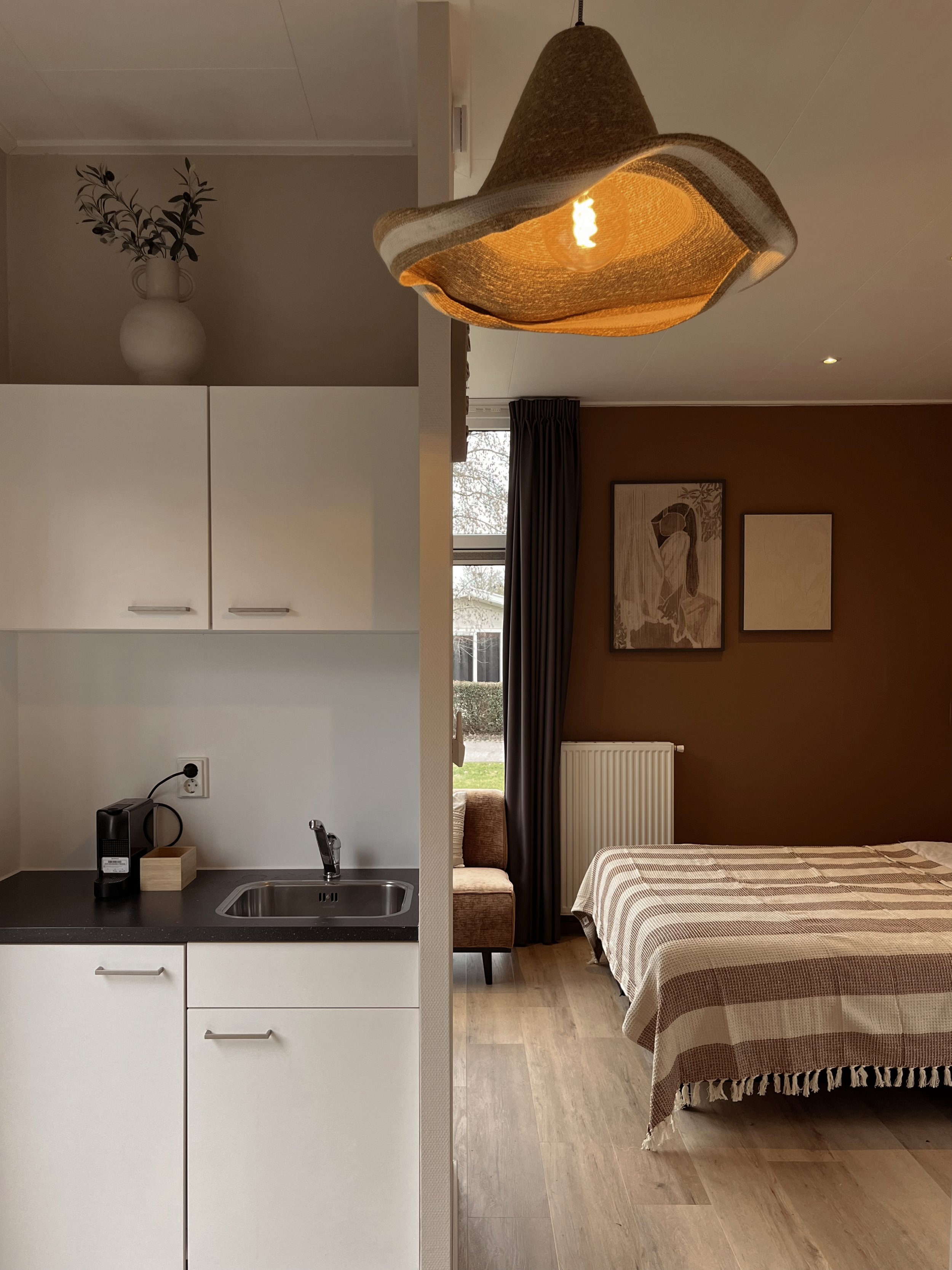De combinatie van natuurlijke materialen, warme kleuren en subtiele verlichting draagt bij aan een comfortabel gevoel, een plek waar gasten echt tot rust komen. Tegelijkertijd zorgen de keuzes ervoor dat de kamers zich onderscheiden binnen het park en herkenbaar blijven.